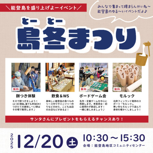 12/20土曜日は島冬(とーとー)まつり 未分類 2025.12.15 今週の土曜日、12月20日はコミュニティセンターで「島冬(とーとー)まつり」を開催します! 餅つき体験・飲食ブース・体験ブース・ボードゲーム会・モルックなどが出来ます♪ サンタさんも来ます!会えたらプレゼントがもらえるよ★ 皆さん能登島に遊びに来てください★ 主催:能登島地域づくり協議会・のとじまーけっと実行委員会
