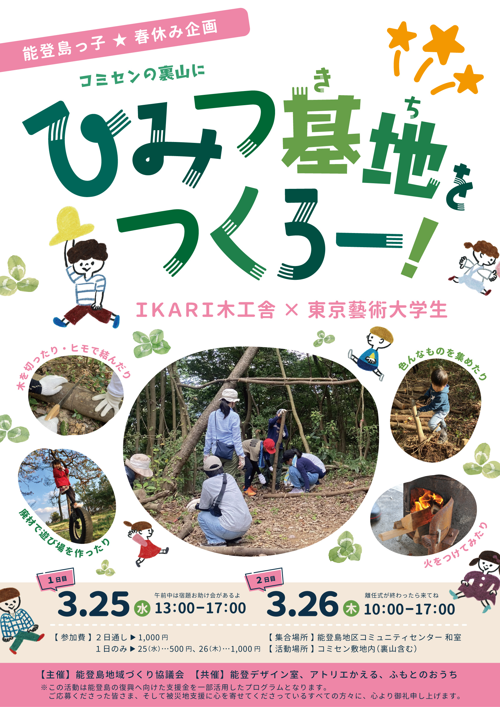 富山県の木工作家IKARI木工舎さんと東京芸術大学の学生3名を迎え、自然の中で「表現すること」「アートを他学ぶこと」を身近に体験してもらいたいと思っています。